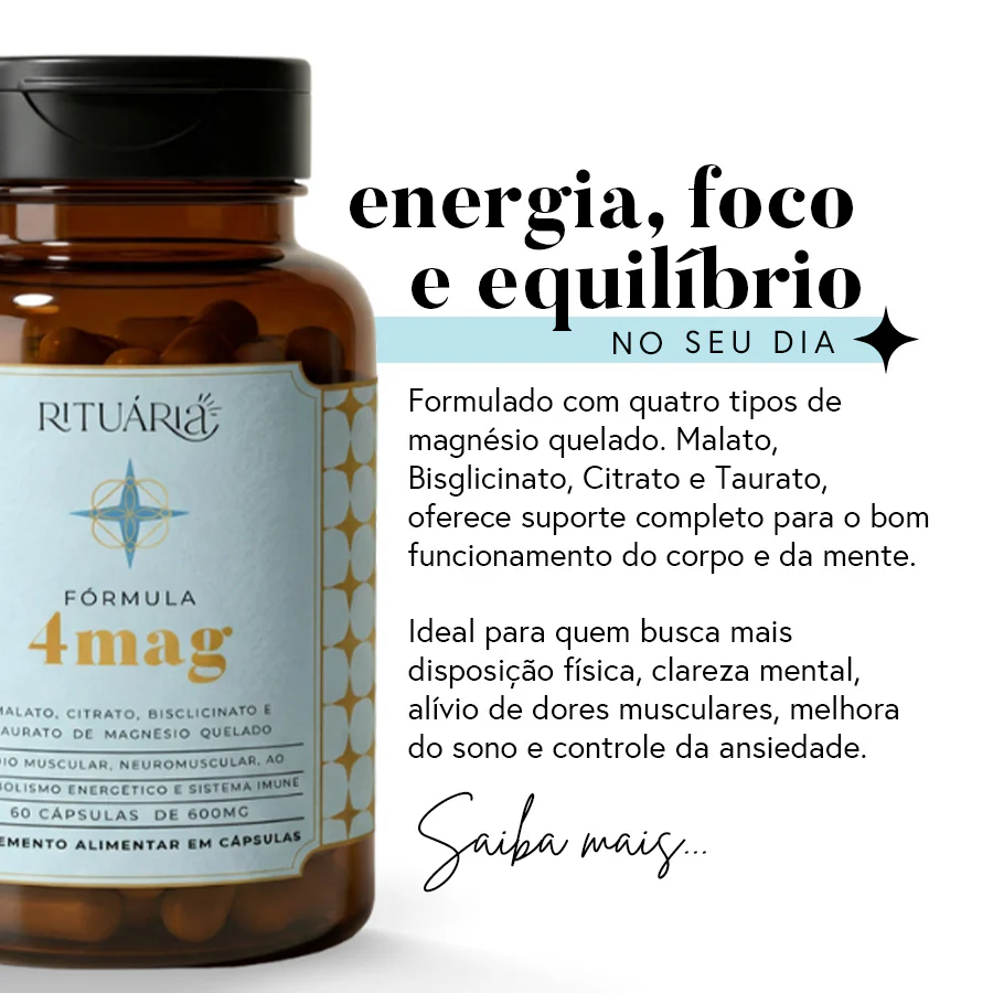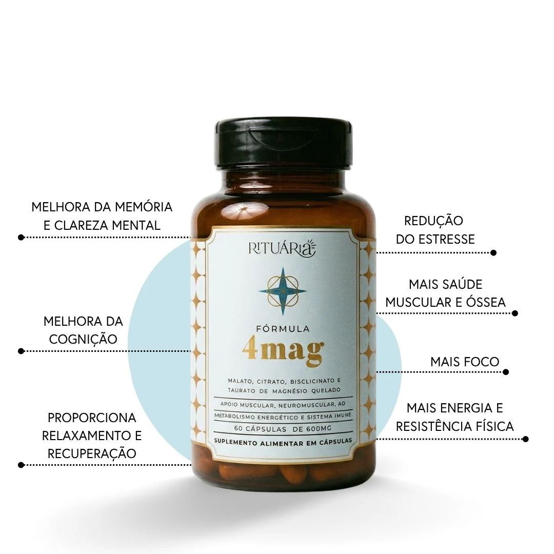 O 4Mag da Rituária é um suplemento nutricional avançado formulado para proporcionar suporte abrangente à saúde do cérebro, músculos, ossos e sistema nervoso. Este suplemento combina quatro formas altamente biodisponíveis de magnésio: Malato, Bisglicinato, Citrato e Taurato de magnésio, oferecendo os benefícios sinérgicos desses compostos para promover o bem-estar geral. A fórmula ainda conta com Vitamina B6 e Treonina para potencializar a absorção e o efeito relaxante.