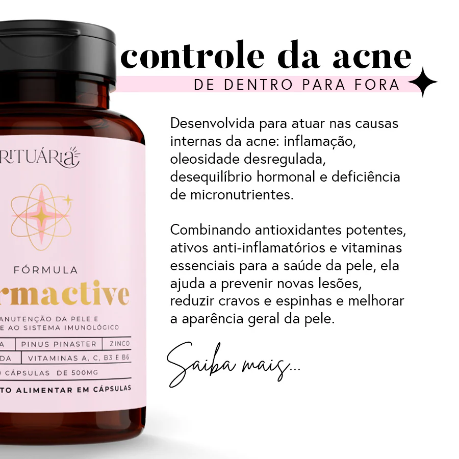 Dermactive é uma solução inovadora para controle da acne de dentro para fora. Desenvolvida para tratar as causas internas da acne, atuando na inflamação, oleosidade desregulada, desequilíbrio hormonal e deficiência de micronutrientes. Com uma combinação de antioxidantes potentes, ativos anti-inflamatórios e vitaminas essenciais, a Dermactive ajuda a prevenir novas lesões, reduzir cravos e espinhas, e melhorar a aparência geral da pele.